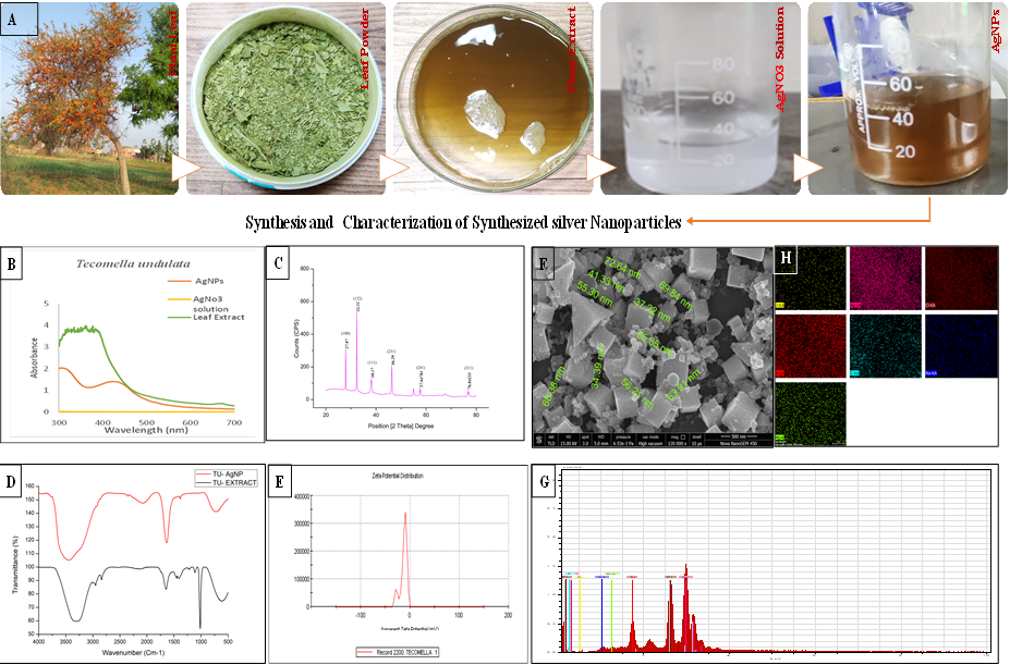 Fig. 1 A: Process of the preparation of the 50 % MeOH Plant extract and synthesis of AgNPs. B: Comparative UV-Visible spectrophotometric analysis for characterization of Synthesized AgNPs with crude MeOH extract and AgNO3 solution. C: X-Ray Diffractogram of AgNPs. D: Comparative FTIR Spectra of T. undulata AgNPs and methanolic extract. E: Zeta-potential analysis. F: SEM Imaging G: and H: EDX analysis of T. undulata AgNPs and components found on EDX analysis, respectively