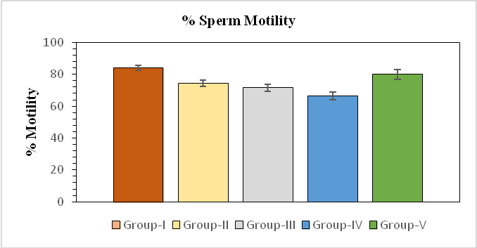 Cauda epididymal sperm parameters showed evidence of dose dependent effects on sperm motility, as it was significantly diminished in Group II, III and IV. The qualitative sperm motility was reduced and poor quality of spermatozoa movement was observed. A great decline was also observed in Sperm density, which was significantly higher in Group-IV at a dose level of 30 mg/kg. B. wt. and relatively low for Group-III (20 mg/kg. B. wt.) and Group-II (10 mg/kg. B. wt). After experiment, 30 d recovery period was followed, without administration of any dose, which showed a perfect recovery in Group-V (fig. 2 and 3).
