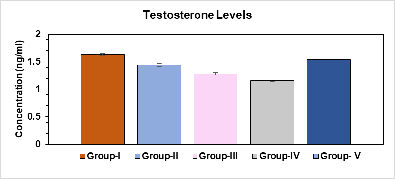The level of serum testosterone decreased significantly in all treatment Groups II, III and IV (P≤ 0.01), compared to vehicle-treated control animals. However, Group-V demonstrated a recovery to normal levels (fig. 4).