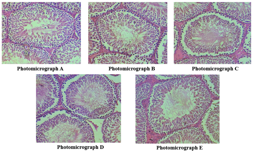 In the control (vehicle-treated) Group-I (Photomicrograph-A), the seminiferous tubules exhibit fully intact germinal epithelium with a well-preserved basement membrane, and the lumen is densely populated with viable spermatozoa. Sertoli cells and embedded spermatogonia maintain their normal morphology and Leydig cells appear fully developed. In Group II (Photomicrograph-B), treated with AgNPs at a dose of 10 mg/kg. B. wt. for 60 d, mild loosening of the germinal epithelium is evident, along with a reduced number of spermatozoa, some of which display degenerative changes. Group III (Photomicrograph-C), shows more pronounced desquamation of the germinal epithelium, while in Group IV (Photomicrograph-D), severe necrosis, extensive structural alterations, a marked reduction or complete absence of functional spermatozoa, and degeneration of Leydig cells was observed. However, after 30 d of treatment withdrawal in Group V (Photomicrograph-E), a significant recovery is observed, characterized by the regeneration of the seminiferous epithelium, restoration of Leydig cell function and an increased number of active spermatozoa, as depicted in photomicrograph E.