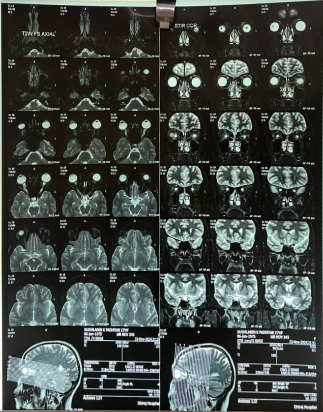 Lumbar puncture was performed at an high opening pressure. Examination of cerebrospinal fluid (CSF) indicated normal cell count, glucose, and protein levels. A bilateral papillary edema could be caused by structural cerebral abnormalities, such as benign or malignant brain tumors, vascular lesions, or inflammation/infections (cerebral abscess), which were ruled out by neurologic and MRI examinations. All inflammatory tests were negative, excluding the possibility of an autoimmune disorder. Chronic intracranial hypertension can be caused by a variety of factors, including tetracycline, blood clots in the brain, high vitamin A intake, and brain tumors. It can also occur without a clear cause based on the patient's medical history. In our case, MRI brain with orbit showed flattening of posterior sclera and protrusion of optic nerve heads along with vertical tortuosity of optic nerve sheath, which was suggestive of possibility of pseudotumor cerebri (fig. 1).