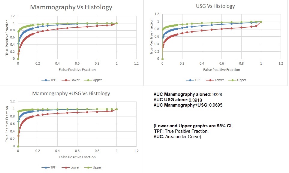 When ROC analysis was done in predicting breast malignancy, the combined predictive ability of mammography plus ultrasound (AUC=0.9695) was higher than that of mammography alone (AUC=0.9328) as well as ultrasound alone (AUC=0.8918) [fig. 1].