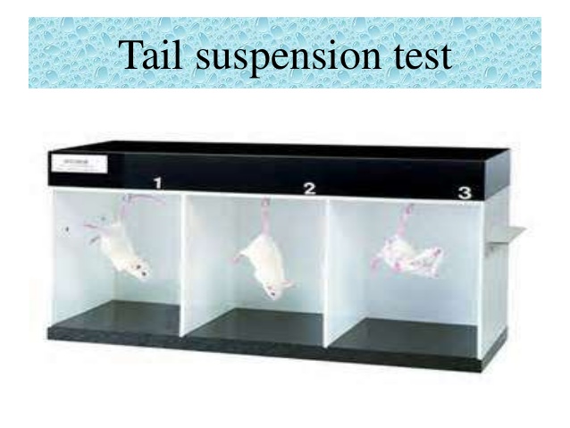 b) Tail suspension test in mice: In this model, Groups of 5 animals are treated with the test compounds or the vehicle by intraperitoneal injection 30 min prior to testing. For the test the mice are suspended on the edge of a shelf 58 cm above a tabletop by adhesive tape placed approximately 1 cm from the tip of the tail. The duration of immobility is recorded for a period of 5 min. Mice is considered immobile when they hang passively and completely motionless for at least 1 min.