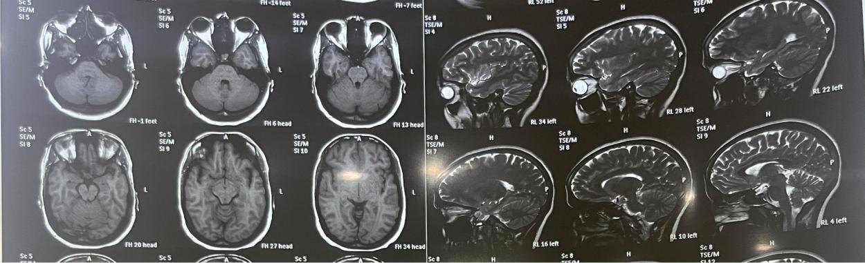 A 27 y old female appeared with a month's worth of headaches and hazy eyesight. Severe Headache was evident on both sides of the occipital region, along with nausea. For one month, the patient had blurred vision that lasted only a few seconds and resolved spontaneously. Her BMI was normal when she was examined. There was no major personal or family history. The intraocular pressure in both eyes was 17 mmHg, according to aplan tonometry. Light perception and projection were present in both eyes. Both eyes showed a papillary light reflex. Ophalmoscopy of both eyes revealed papilledema, no boundaries on the optic nerve head, dilated retinal veins, and a chrysanthemum flower in the right eye. Visual field tests found an increasing blind spot in both eyes, as well as some paracentral scotoma. The lumbar puncture was conducted with a high opening pressure of 250 mmH2O. The CSF test revealed no abnormalities. All required blood tests were performed, which turned out to be normal. The MRI brain with orbit revealed flattening of the posterior sclera, protrusion of the optic nerve heads, and vertical tortuosity of the optic nerve sheath, which suggested the likelihood of pseudotumour cerebri fig. 1. Because of the minor visual field loss, treatment began while in the hospital with mannitol (20%) TID and acetazolamide 500 mg BD. Methylprednisolone injections (1g/d) were given for 5 d. Before being discharged from the hospital, it was recommended to limit physical activity and treat with acetazolamide 250 mg BD and oral prednisolone in decreasing doses. After a month, the follow-up assessment indicated maximal visual acuity in both eyes without correction. An opthalmoscopy examination indicated bilateral mild papilloedema. The study of the visual field indicated very minimal modifications. After a two-month follow-up, there was no Papilloedema and no headaches or blurred vision.