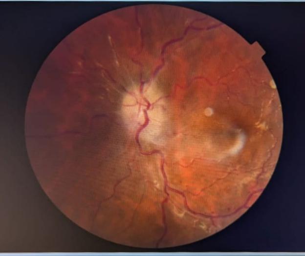 Fig. 5: Fundoscopic changes of papilloedema, dot blot hemorrhages and macular edema