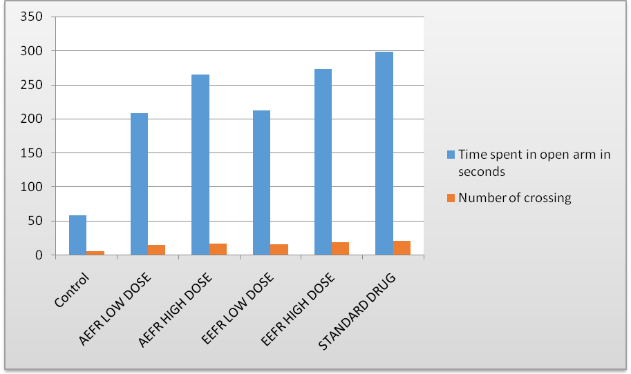 When Ethanolic extract of Ficusreligiosa (250 mg/kg) orally administered, have shown time spent in open arms (212.2±2.778) and number of crossingss (15.0±0.446) is significant. When Ethanolic extract of Ficusreligiosa (500 mg/kg) orally administered, have shown time spent in open arms (272.8±2.598) and number of crossings (18.6±0.506) is significant. When standard dose of Diazepam (1 mg/kg) was orally administered, have shown time spent in open arms (298±1.814) and number of crossings (20.6±0.816) is more significant.