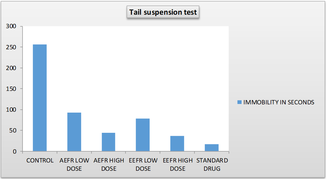 In TST (Tail suspension test), Group-Control 1% w/v sodium CMC (0.5 mg/kg, p. o) drug administration have shown their immobility (256±4.808) insignificant. When aqueous extract of Ficusreligiosa (250 mg/kg) orally administered, have shown immobility (92.2±2.3846) is significant. When aqueous extract of Ficusreligiosa (500 mg/kg) orally administered, have shown immobility (44.4±1.866) is significant. When Ethanolic extract of Ficusreligiosa (250 mg/kg) orally administered, have shown immobility (78±2.764) is significant. When Ethanolic extract of Ficusreligiosa (500 mg/kg) orally administered, have shown immobility (36.8±2.696) is significant. When standard dose of fluoxetine (10 mg/kg) was orally administered, have shown immobility (16.4±1.628) is more significant.