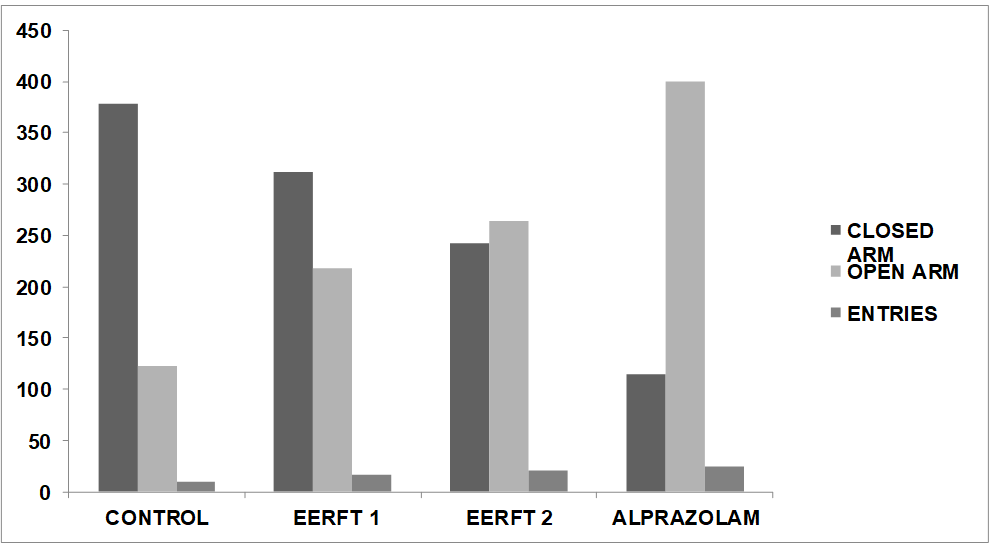 Group 1: In this group animals were treated with normal saline solution in which mice spent 122.8±2.34 sec in open arm and 378.6±1.53 sec in closed arm and no. of crossings were 10±2.01.