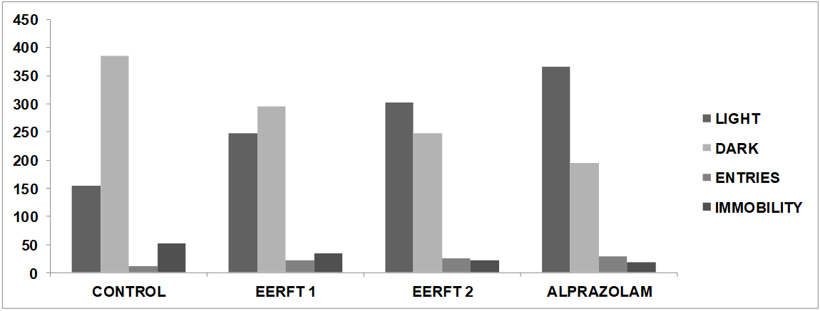 Group 4: In this group animals were treated with Alprazolam (0.25 mg/kg) solution in which mice spent 366.3±2.56 sec in light chamber and 194±0.25 sec in dark chamber and no. of crossings were 28±0.21. Immobility period was 18.5±0.16 sec.