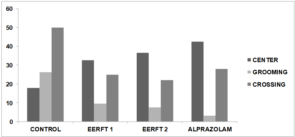 The vehicle-treated mice (Normal control) had spent more time in center area, less number of grooming and showed less crossing compared to test and standard drug treated group animals during 10 min.