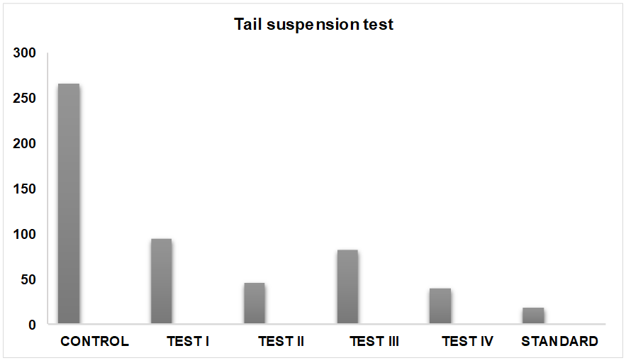 Treatment with Fluoxetine significantly decreased the duration of immobility time (P<0.001) in TST. Ethanolic and aqueous extract of Aeglemarmelos treated mice also exhibited dose dependent significant decreased the duration of immobility time.