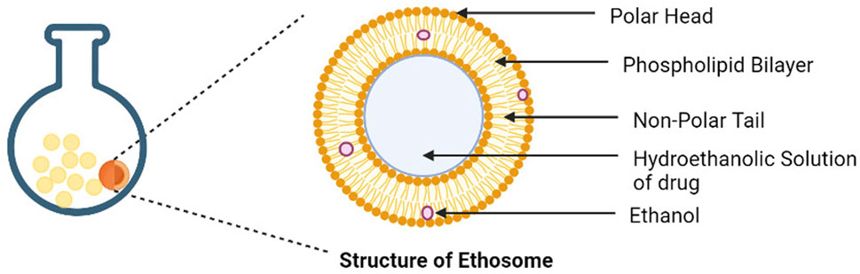 Higher ethosome deformability and entrapment efficiency are provided by this composition, improving topical medication administration of highly concentrated active components, transdermal transport effectiveness, and, in contrast to liposomes, extends the ethosomes' physical stability through the flexibility of the lecithin bilayer [26] as per fig. 5.