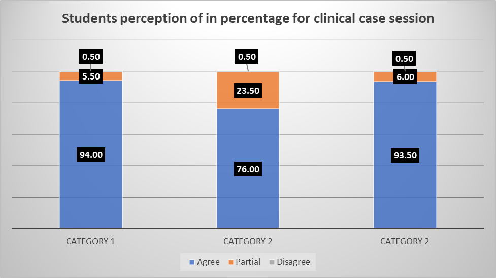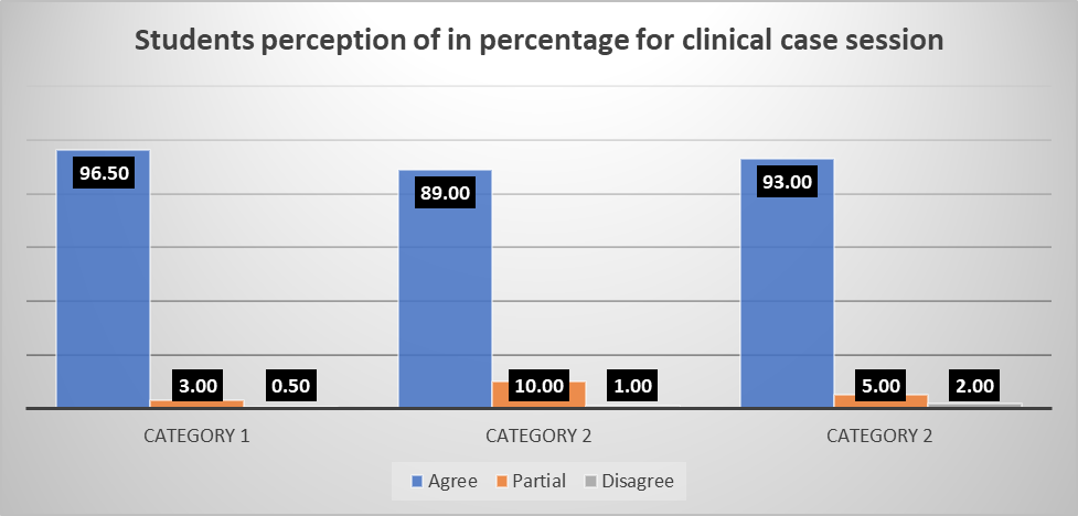 Fig. 3: Student's perception of in percentage for clinical case session, category 1-CCS helped me to correlate theory concepts with their clinical applicability, Category 2-CCS provokes critical thinking required regarding laboratory investigations, their interpretation and decision-making skills, Category 3-CCS generates my interest in biochemistry as well as its importance in clinical medicine.