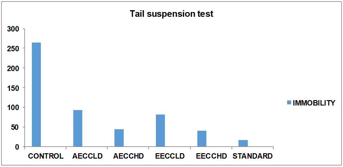 Treatment with Fluoxetine significantly decreased the duration of immobility time (P<0.001) in TST. Ethanolic and aqueous extract of Cymbopogoncitratus treated mice also exhibited dose-dependent significant decreased the duration of immobility time. The duration of immobility was also significantly reduced as compared to the vehicle-treated group. But there is no significant difference between Cymbopogoncitratus extracts treated animals and Fluoxetine treated animal. The above observation suggests that Cymbopogoncitratus has antidepressant activity.