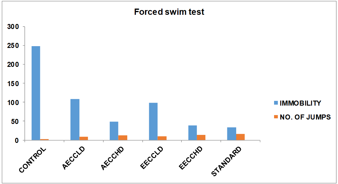 Group 1: In this group animals were treated with Normal saline solution in which mice Immobility period was 248±2.984 sec. and numbers of jumps were 2.4±0.376.