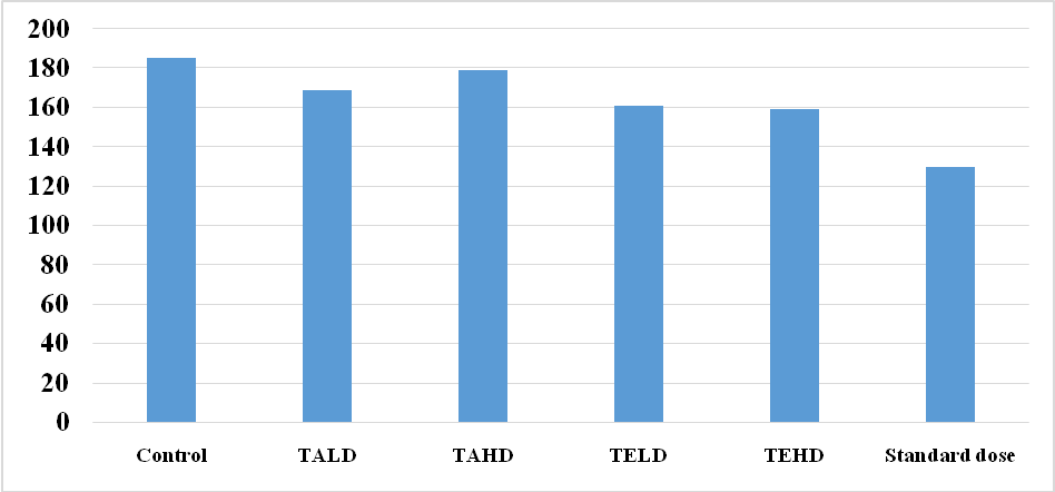 Fig. 3: Graph showing the corticosterone levels in post tail suspension test experiments, Note: TALD= Test Aqueous lower dose; TAHD= Test Aqueous higher dose; TELD= Test Ethanolic lower dose; TEHD= Test Ethanolic higher dose; STD= standard
