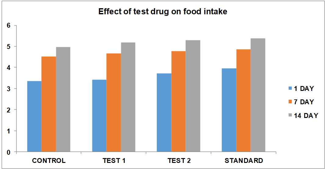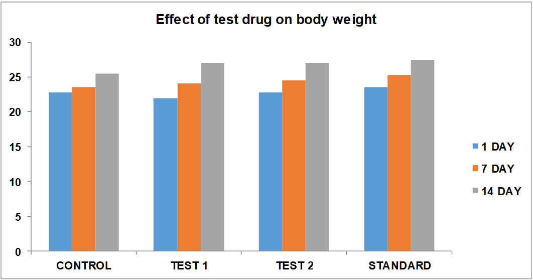Both test group, mice of 6 no. in each group, Treated with Piper betel extract (250 and 500 mg/kg/p. o.), respectively, showed significantly (p<0.05) increased in body weight as compared to the control group. Treatment with DZP (4 mg/kg i. p.) the body weight significantly increased as compared to normal group.