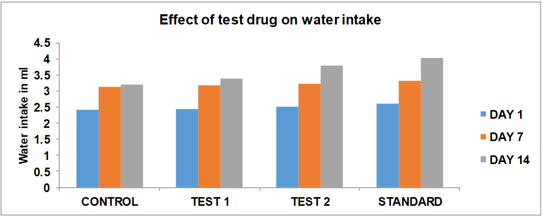 The mice group treated with Piper betel extract (250 and 500 mg/kg/p.o.) showed significantly (p<0.05) increased in body water intake as compared to the control group. Treatment with DZP (4 mg/kg i.p.) the water intake significantly (p<0.05) increased as compared to test group.