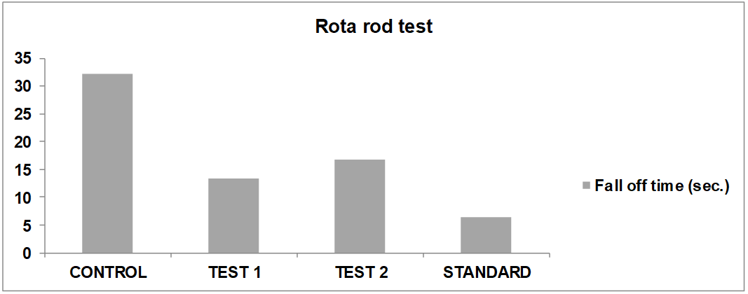 This test comprises to evaluate the activity of drugs interfering with motor coordination. The application consists of horizontal metal rod of 3 cm diameter attached to a motor with the speed of 15-20rpm. The rod is divided in six reactions with wooden compartment. It allows simultaneous testing of six rats. The rod is at a height of 50 cm above the table top in order to discourage the animal from falling off. The test animal along with normal animals, are placed on rotating rod and tested for the time of fall from the roller and their behaviour before and after administration of corresponding drugs. The difference in fall of time from the rotating rod between the control and treated rats was taken as an index of muscle relaxation.