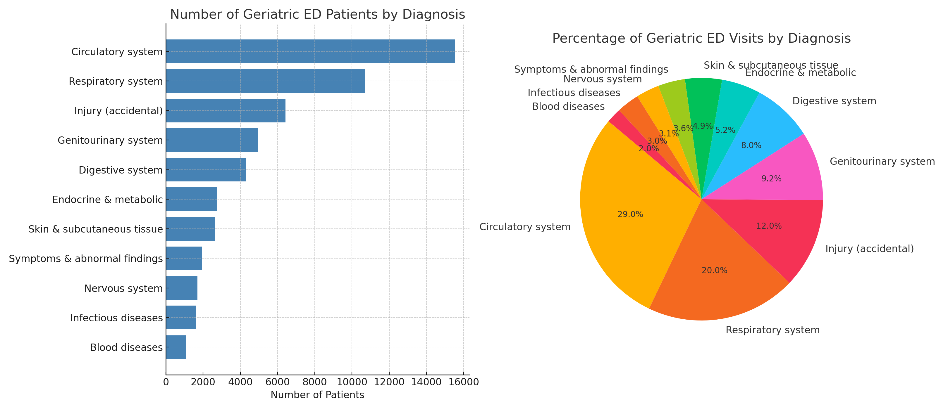 The study reveals a substantial proportion of ED visits by the geriatric population, consistent with global trends. The predominance of cardiovascular and respiratory complaints underscores the burden of chronic illnesses in this age group. Effective triage, geriatric-specific protocols, and dedicated training for emergency physicians are essential to improve outcomes. Further research is warranted to explore long-term outcomes and resource utilization by geriatric ED visitors.