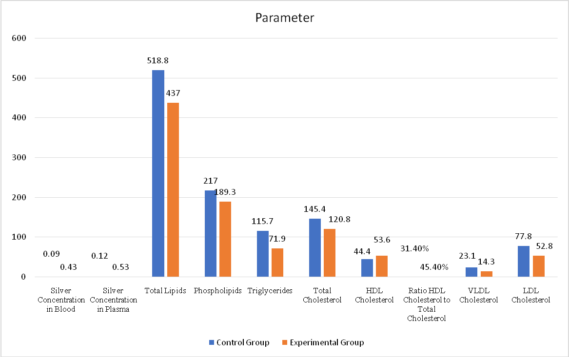 Silver levels in blood and plasma were measured in µg/ml. Lipid parameters, including total lipids, phospholipids, triglycerides, total cholesterol, HDL, LDL, and VLDL cholesterol, were recorded in mg/dl. The HDL-to-total cholesterol ratio was expressed as a percentage. The data represent mean values for both groups.