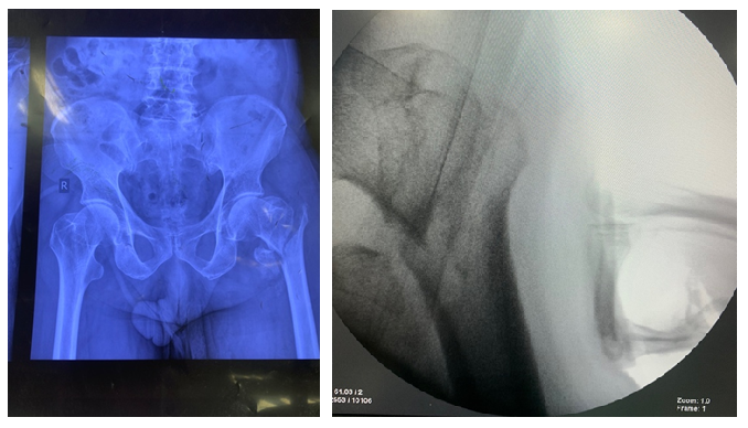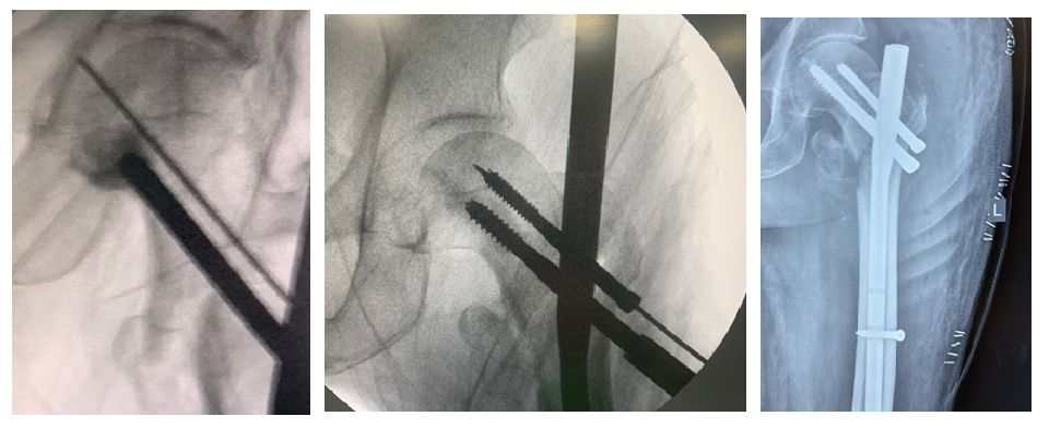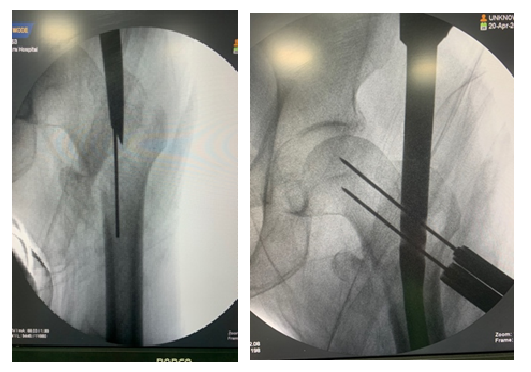Initially, closed reduction was attempted using internal rotation and longitudinal traction. In cases where closed reduction was not feasible, a mini-open approach was employed. This involved making a small longitudinal incision approximately 5 cm proximal to greater trochanter. Gluteal fascia was incised, and gluteus medius was split longitudinally to access tip of trochanter. The correct entry point for nail was determined using fluoroscopy, and a guide wire was advanced from trochanter to medulla (fig. 2).