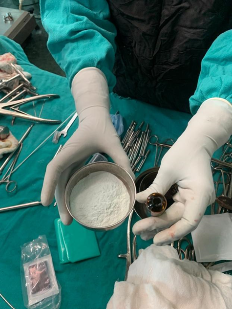 After obtaining necessary measurements, poly methyl methacrylate (PMMA) (fig. 5) bone cement was prepared, and using newly designed device, the cement was inserted (in doughy state) into the femoral head through predrilled screw site under fluoroscopic supervision (fig. 6).