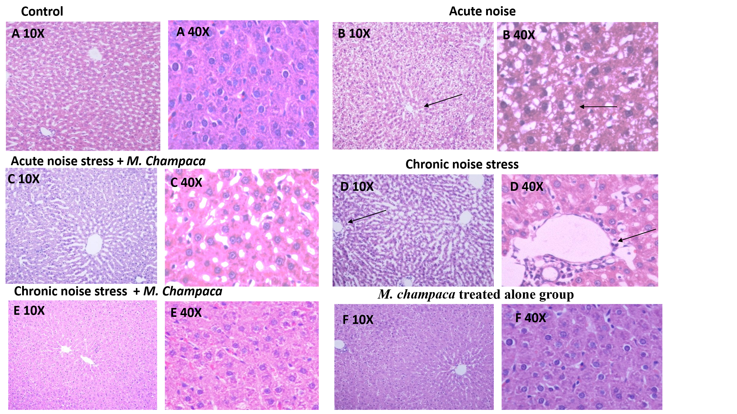 Fig. 1: Illustrates H and E-stained liver cells of rat’s in different experimental groups at 10X and 40X magnification. (A) Control, (B) Acute noise stress alone, (C) Acute noise stress+M. champaca, (D) Chronic noise stress, (E) Chronic noise stress+M. champaca, (F) M. champaca treated alone group