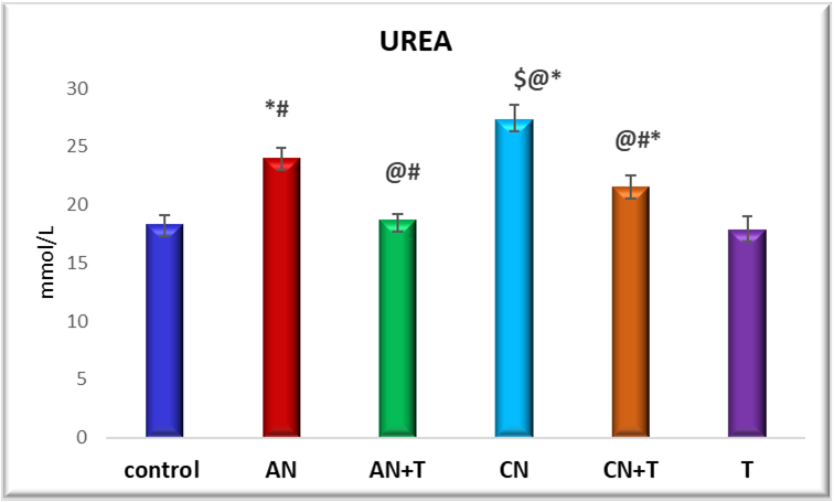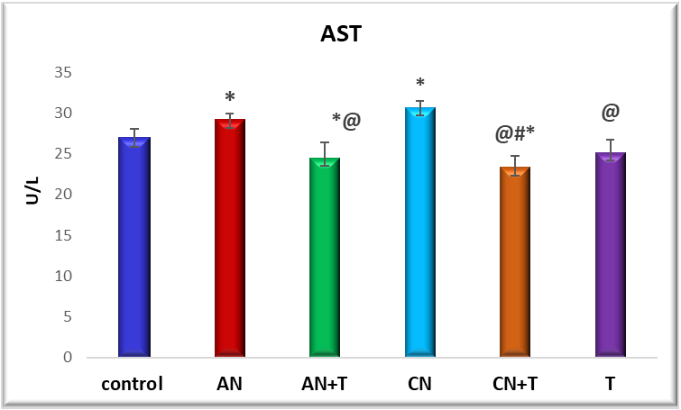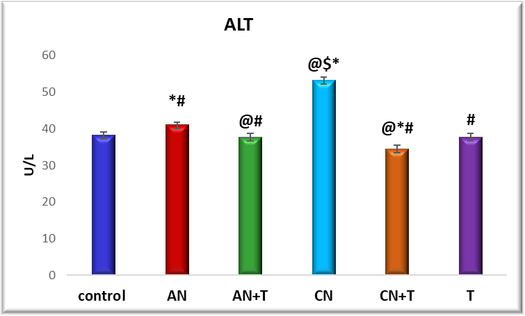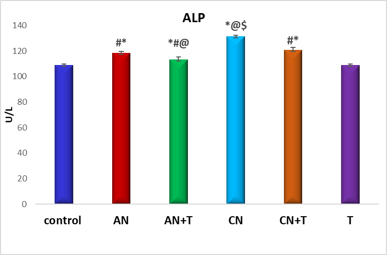 These effects are supported by histopathological evidence (fig. 1) and are accompanied by elevated levels of liver enzymes-AST (aspartate aminotransferase), ALT (alanine transaminase), ALP (alkaline phosphatase) (fig. 2-4)-accompanied by a rise in blood urea and creatinine levels (fig. 5 and 6).