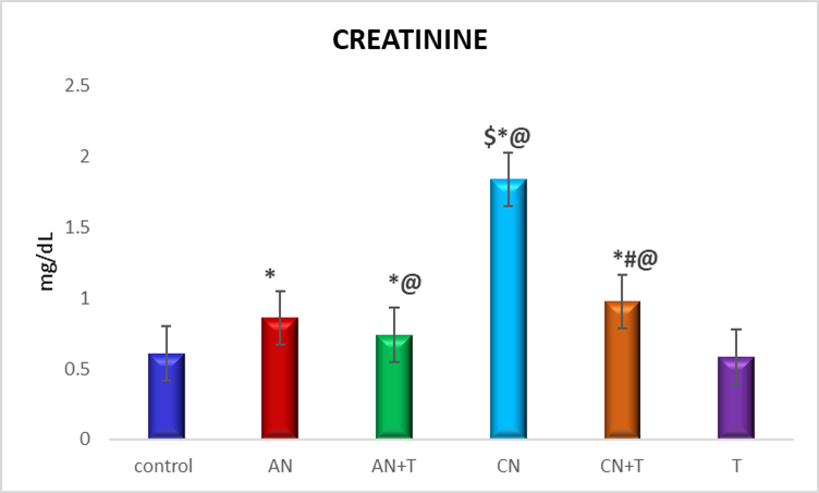 The current study observed a significant increase (p<0.05) in serum creatinine levels in both acute and chronic noise-exposed rats, (fig. 6) with a more pronounced increase noted in the chronic exposure group. Elevated levels of urea and creatinine indicate impaired kidney function, as the kidneys are less able to filter and excrete metabolic waste products effectively. According to Matsumoto et al. [42], increased serum creatinine may result from enhanced catabolism in muscle and tissues, leading to its elevated synthesis.