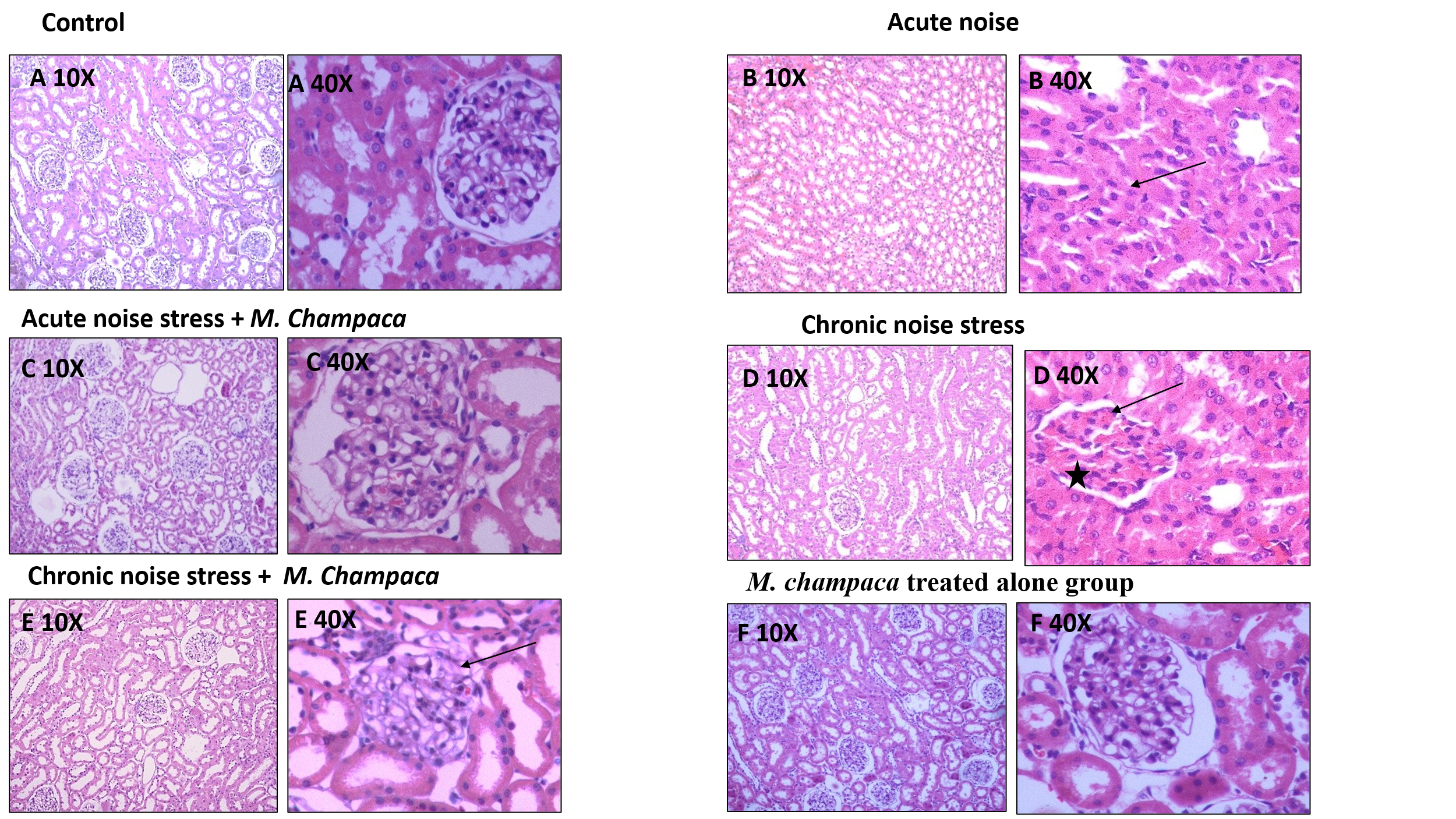 In the kidneys, stress-induced oxidative damage resulted in several degenerative changes, as seen in our chronic noise-exposed group. Compared to the acute group, which showed minimal histological changes, chronic exposure led to brush border destruction, tubular cell vacuolization, and vascular congestion (fig. 7D). Treatment with M. champaca reduced these effects (fig. 7C and E). Kidney cortices from control animals and those treated with the drug showed a normal distribution of collagen fibers.