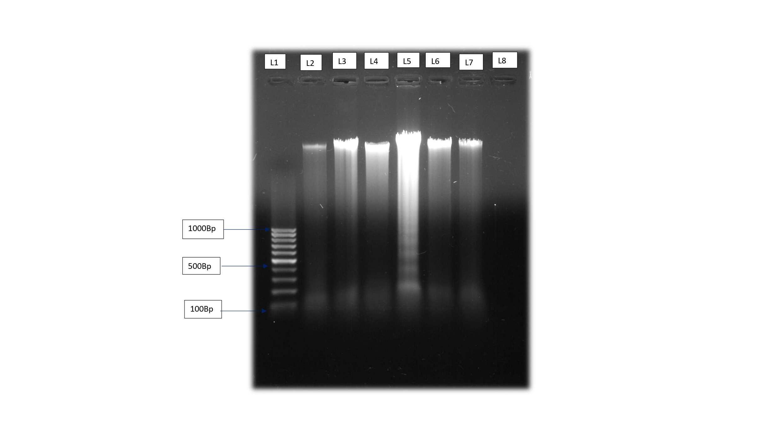 In contrast, liver tissues from animals exposed to chronic noise stress exhibited clear DNA fragmentation, (Fig; 8 lane 5) a hallmark of genotoxic damage. This suggests that prolonged noise exposure leads to significant DNA damage in hepatic cells. Notably, animals in the chronic noise stress group that received M. champaca treatment showed a marked reduction in DNA fragmentation, indicating that the plant extract may confer protective effects against noise-induced genotoxicity.