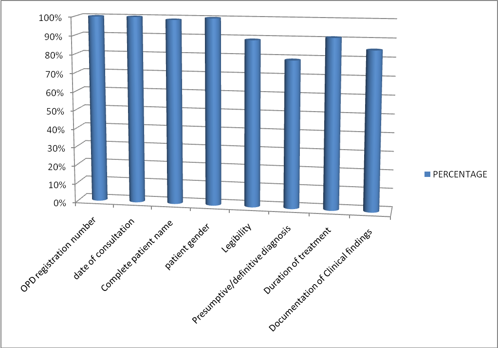 Results: The present study demonstrates that the OPD registration number, date of consultation, and patient gender were consistently recorded in all prescriptions (100%), but complete patient names missing in 1.2% of prescriptions. The handwritings on 11% of prescriptions were not legible. 78.9% of prescriptions included a record of the salient features of the clinical examination, and just 75.1% mentioned a presumptive or definitive diagnosis. The average number of drugs per prescription was 5.39, indicating a trend towards polypharmacy. 88% of drugs were prescribed by their generic names. Antibiotics were prescribed in 12% of encounters. Drugs used by parenteral route were approximately 5% and percentage of drugs prescribed from EDL (Essential Drug List) is 82%. A notable finding was that only 72% of the prescribed medicines were available in the hospital dispensary.