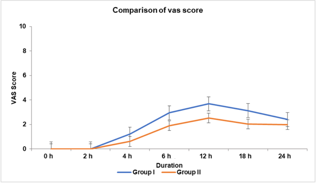 The mean VAS score for pain was zero in both the groups at 0 and 2 h and there was comparable mean VAS score at 4 hin group I(1.2±4.22) in comparison to group II (0.6±1.85)– P value of 0.44. The mean VAS score was statistically significant at 6 h between group I and II (2.95±1.68, vs 1.90±1.47, p value 0.006**) and at 12 h (3.68±2.0 vs 2.52±1.38, p value 0.005**). At 18 h, the mean VAS score was 3.12±1.28 in group I and 2.03±1.72 in group II, which was statistically significant with p value of 0.003** and at 24 h, the mean VAS score was comparable between both the groups (fig. 1).