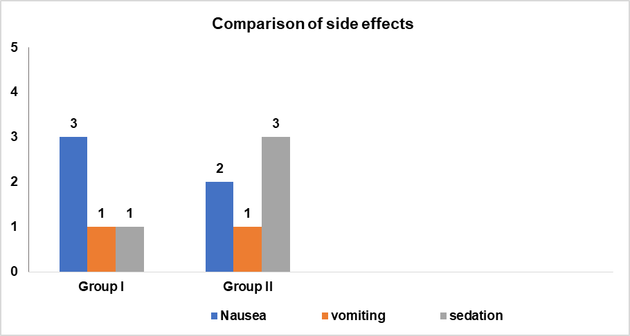 The side effects like Nausea was observed in3 patients (8.3%) in group I and 2 patients (5.5%)in group II and incidence of vomiting was similar in both groups (only 1 patient (2.7%)). 1 patient (2.7%) in group I and 3 patient (8.3%) in group II were found to be sedated. No significant differences in side effects were found between two groups (p value>0.05).
