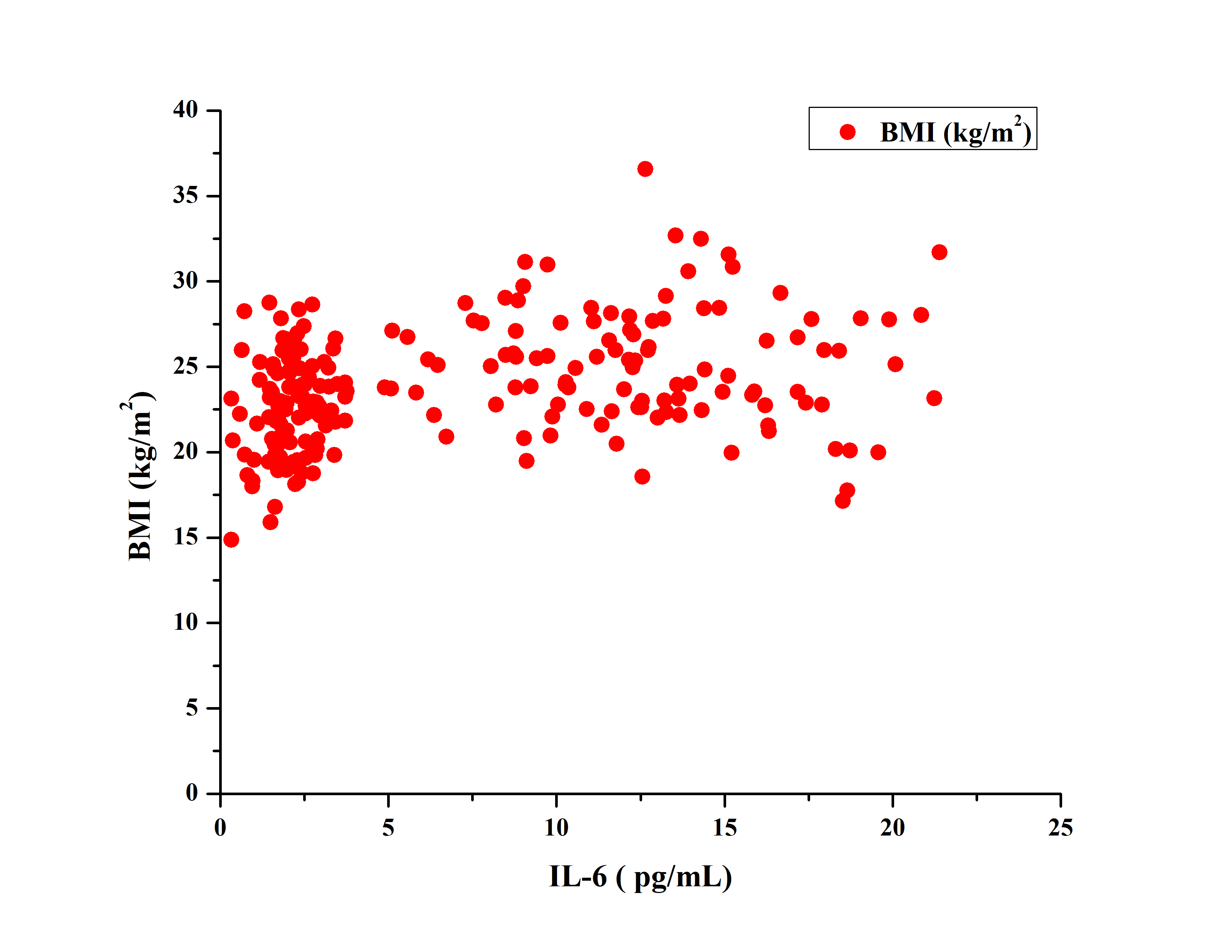 Fig. 3: Showing the correlation between IL-6 and BMI which showed a moderate positive correlation (r = 0.31), IL-6: Interleukin-6, BMI: body mass index