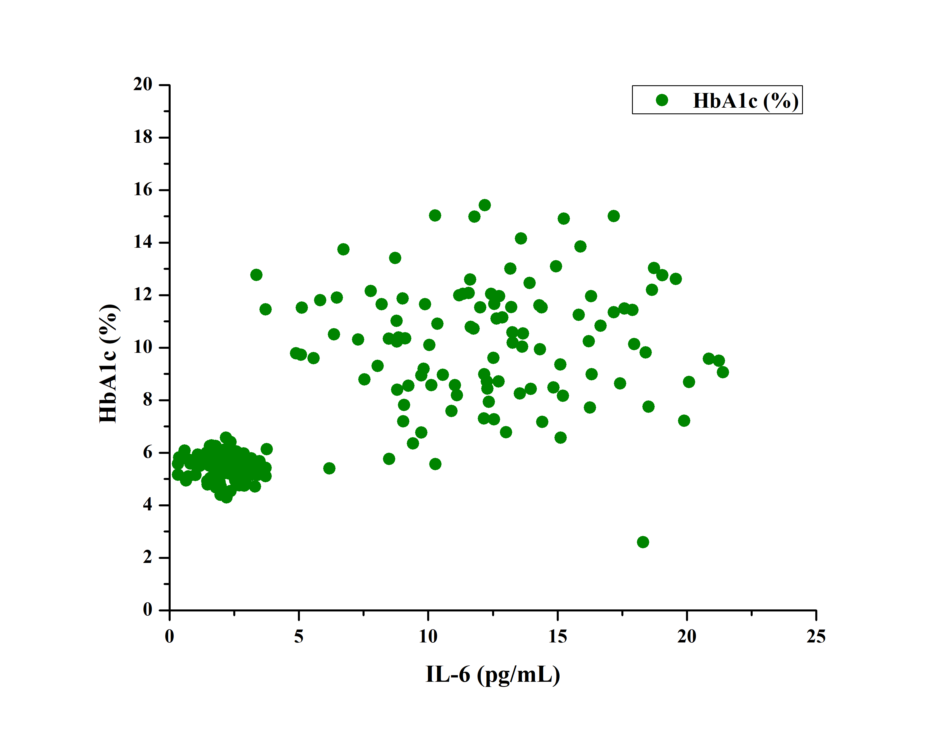 Fig. 4: Showing the correlation between IL-6 and HbA1c% which showed a strong positive correlation (r = 0.70), Abbreviations: IL-6: Interleukin-6, HbA1c: Glycated hemoglobin