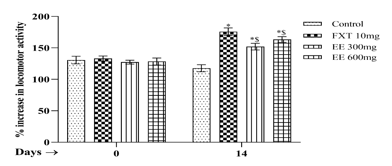 The locomotors activity can be an index of wakefulness (alertness) of mental activity. The locomotors activity can be easily measured using an actophotometer. Activated the Actophotometer to verify the proper functioning of all photo cells to ensure precise recording. Subsequently, individual mice were positioned within the activity cage for a duration of 10 min, during which the activity scores were documented for each animal up to the specified time limit. Finally, the observed motor activity was assessed and juxtaposed with the control or standard.