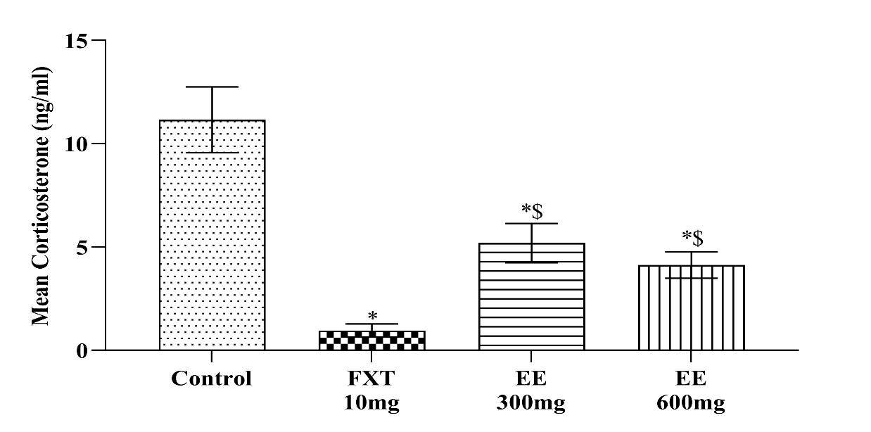 Fig. 3: Effects of ethanolic extract of leaves of piper methysticum and fluoxetine on plasma corticosterone level