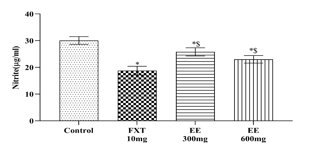 Fig. 4: Effects of ethanolic extract of leaves of piper methysticum and fluoxetine on plasma nitrite level