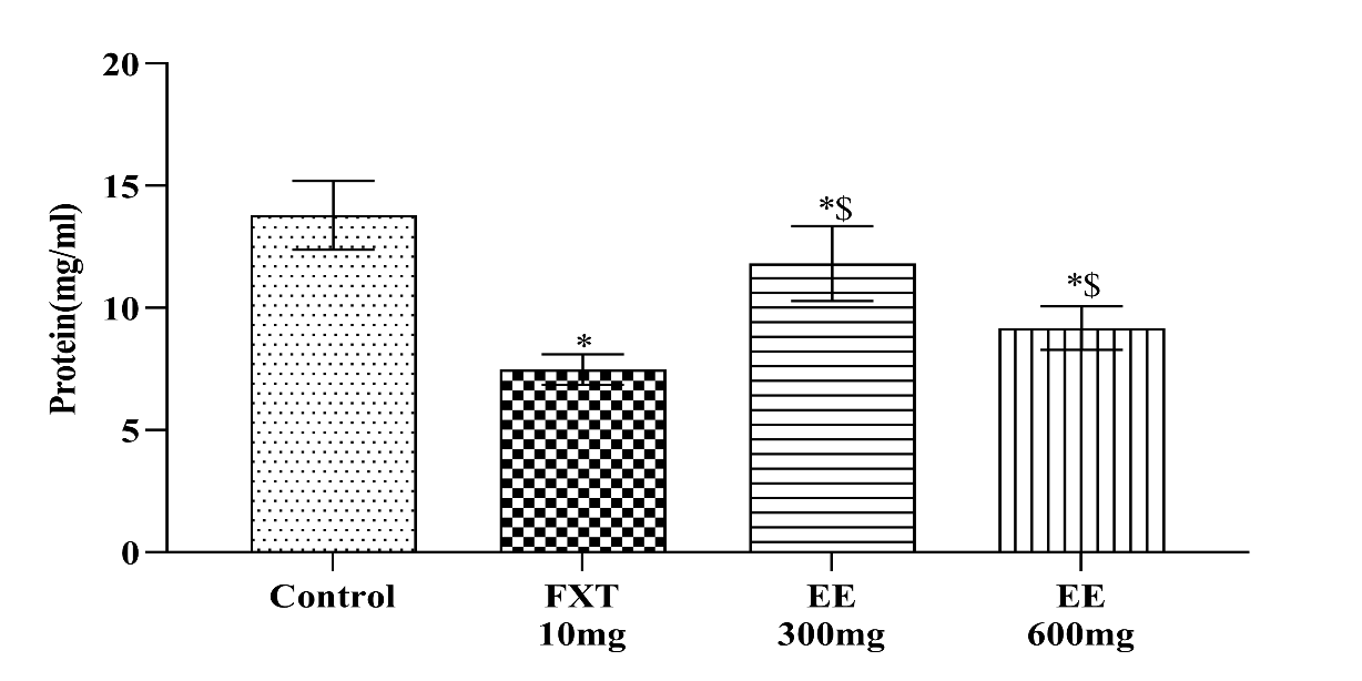 Fig. 5: Effects of ethanolic extract of leaves of piper methysticum and fluoxetine on plasma protein level