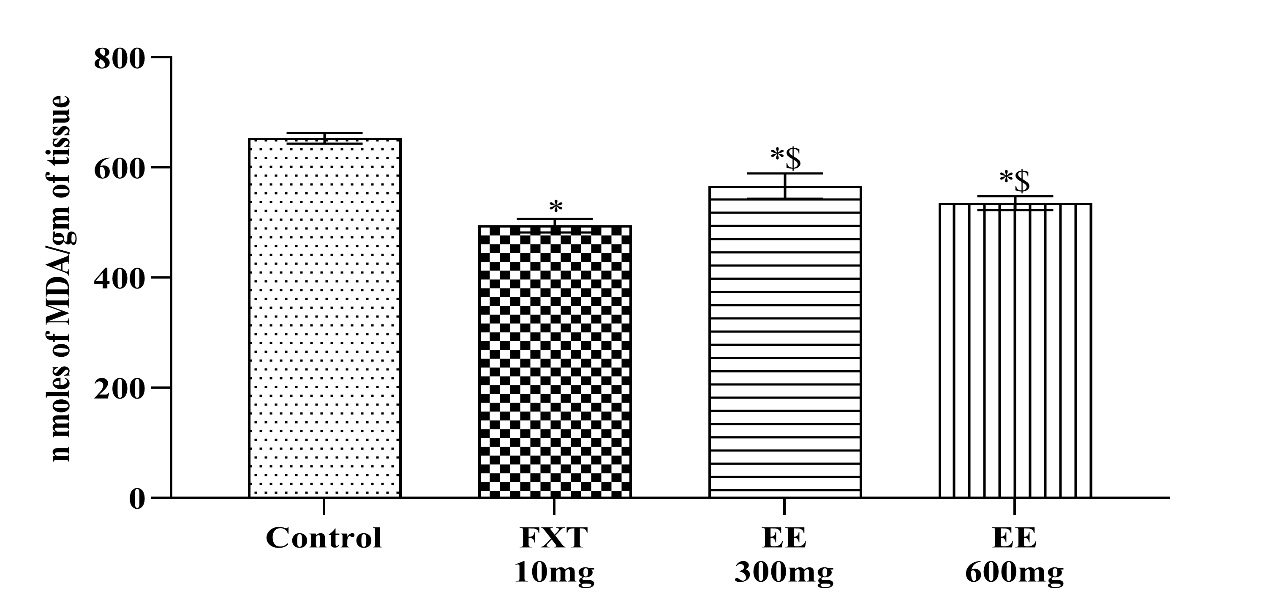 Lipid peroxidation level greater in depressive animals. As shown in fig. 6, after administration of ethanolic extract of leaves of Piper methysticum as 300 and 600 mg/kg and standard Fluoxetine (10 mg/kg) have decreased the lipid peroxidation level. Alcoholic extract of leaves of Piper methysticum 600 mg/kg produced a greater activity which is comparable to that of standard Fluoxetine (10 mg/kg).