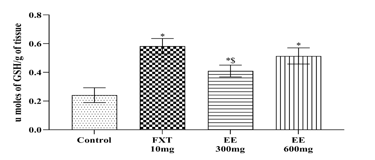 Fig. 7: Effects of ethanolic extract of leaves of piper methysticum and fluoxetine on reduced GSH level