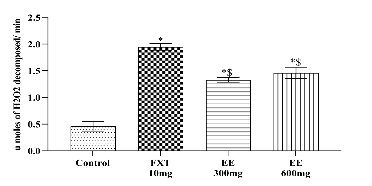 Fig. 8: Effects of ethanolic extract of leaves of piper methysticum and fluoxetine on catalase activity