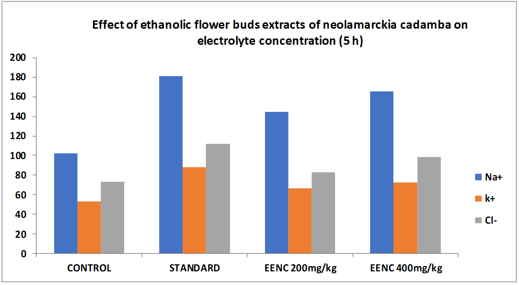 Fig. 2: Effect of ethanolic extracts of Neolamarckia cadamba on urinary electrolyte concentration (in 5 h)