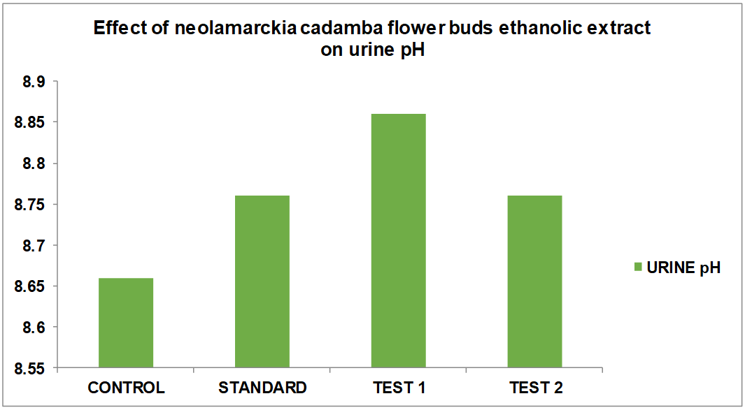Results: In this model when compared to control group the Alcoholic Extract of Flower buds of Neolamarckia cadamba treated groups at different dose levels (200 and 400 mg/kg) have noted with significant increase in the urine volume and also significantly enhanced the excretion of Sodium, Potassium and Chloride ions in urine. In the urine pH no difference has been found.