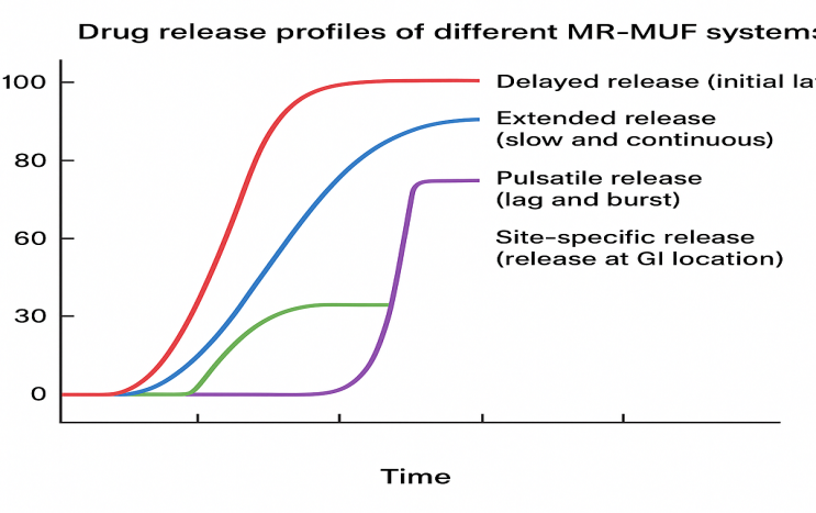 Modified release multiunit dosage forms (MR-MUFs) have become a cornerstone in advanced drug delivery due to their ability to fine-tune drug release patterns based on therapeutic demands. These systems are composed of multiple discrete subunits, such as pellets, beads, or microspheres, each engineered to achieve a controlled release profile. Depending on the clinical objective, MR-MUFs can be designed for delayed release, extended release, pulsatile release, or site-specific delivery. These diverse systems employ various pharmaceutical technologies, including functional coatings, matrix-forming agents, and osmotic systems, to deliver the drug in a predetermined manner [19-22].