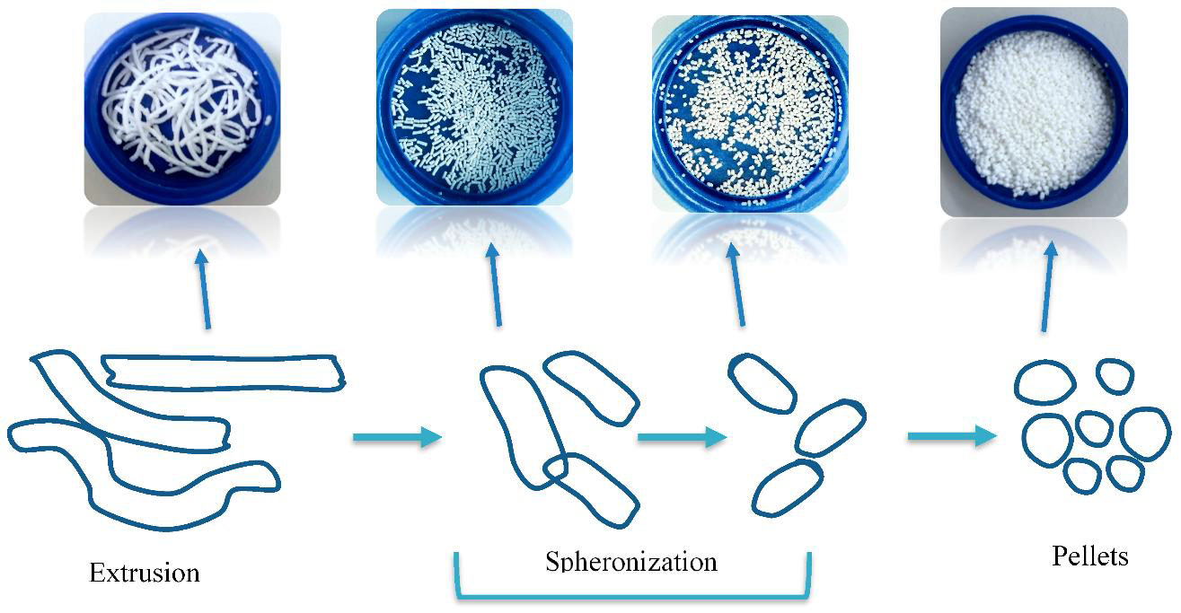 Among the various pelletization methods, extrusion–spheronization remains the most extensively used and well-established technique in industrial-scale production. It involves two primary unit operations: first, a wet mass is prepared by blending the active pharmaceutical ingredient (API) with excipients and a granulating fluid to form a cohesive mixture. This mass is then extruded through a die to form cylindrical extrudates of uniform diameter. In the second stage, these extrudates are broken and rounded into spherical pellets within a high-speed spheronizer, where a rotating friction plate facilitates the shaping process.