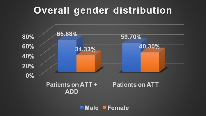 In the gender-wise distribution of the study population, we were found that amongst the study population, there was predominance of male participants on ATT with ADD (n=44, 65.68%) and on ATT (n=40, 59.70%) as compared to female participants on ATT with ADD (n=23, 34.33%) and on ATT (n=27, 40.30%) (fig. 1)