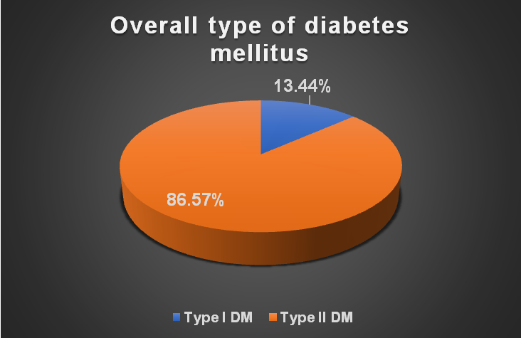 In the type of diabetes mellitus-wise distribution of the study population, we were found that amongst the study population, there was predominance of type II DM (n=58, 86.57%) as compared to type I DM (n=9, 13.44%) (fig. 2).